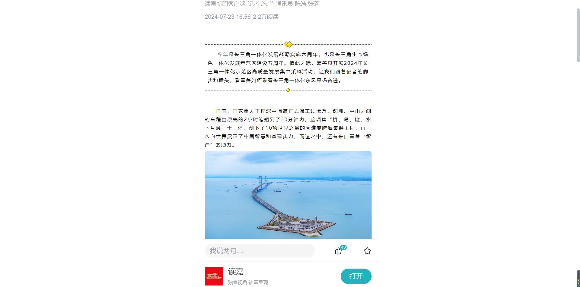 今年是長三角一體化發展戰略實施六周年,也是長三角生態綠色一體化(huà)發展示範(fàn)區建設五周年。值此之際,嘉善(shàn)縣開展2024年長三角一體化示範區高質量(liàng)發展集中采風活動,讓我們跟著記者的腳步和鏡頭,看嘉善如何乘著長三角(jiǎo)一體化東風昂揚奮進。