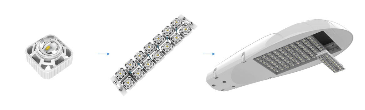 LED芯片自封(fēng)裝→單顆像素的光學設計,並成獨立發光體(獨立像(xiàng)素發光)→多顆像素組合成發光模組→根據應用(yòng)環境需求(qiú)配置不同功率的成品路燈頭