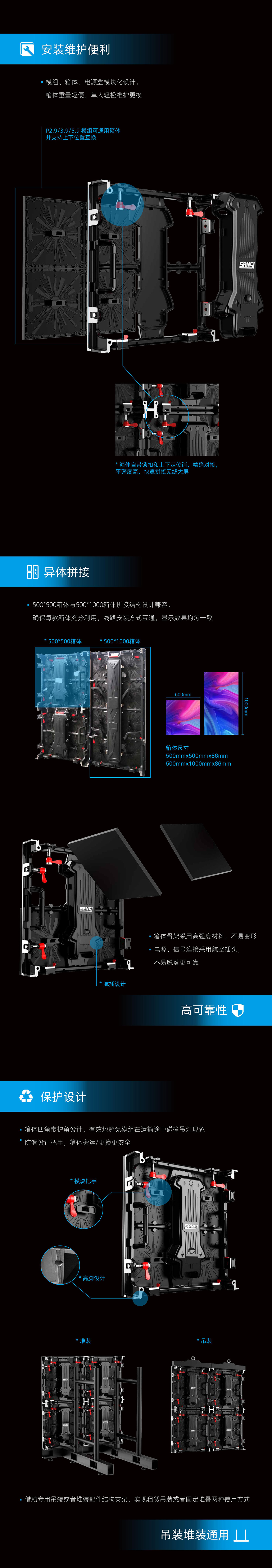 VR係列是為(wéi)租賃市場量(liàng)身(shēn)打造的(de)一款高性價比(bǐ)室內全彩顯示屏產品。壓鑄鋁一體成(chéng)型的箱體輕、薄,平整度高,易拚接、無縫隙,單(dān)人可快速安裝。安裝方式靈活,滿足各種不同場合需求。1:1顯示寬高比,輕鬆(sōng)拚接不同比例大屏。箱體造型美觀(guān)、走線簡潔。適用於大型會議、展覽、演出、企業活動等各種室內活動場景。