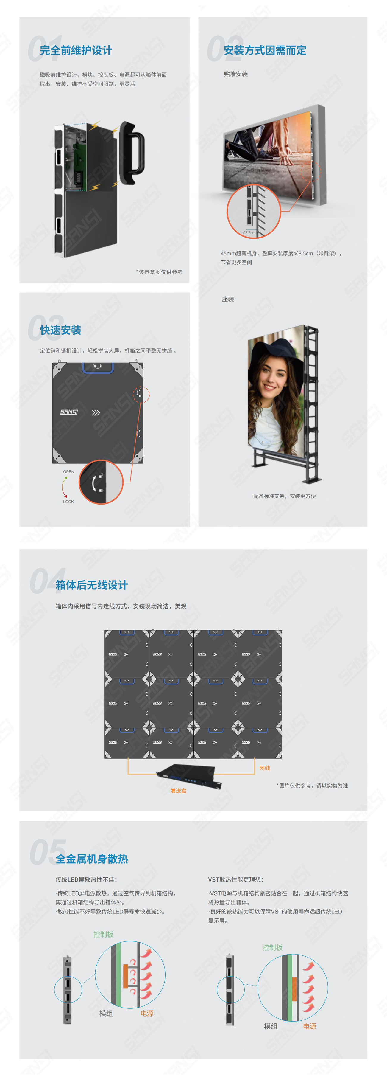 VST係列秉承了(le)三(sān)思(sī)產品一(yī)貫(guàn)的高穩定性和出色的顯示效果,是一款專業級前(qián)維護小間距顯示產品。