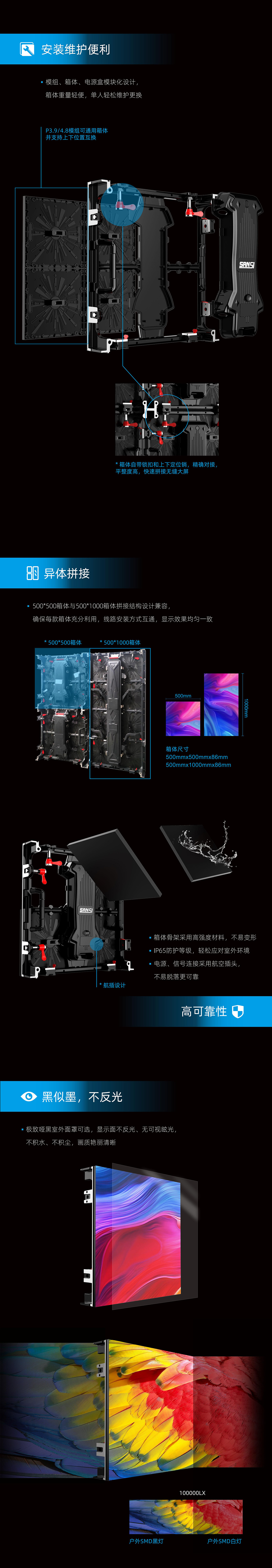 XR係列是(shì)為(wéi)租賃市場量身打造的一款高性價比室(shì)外全彩顯示屏產品。壓鑄鋁一體成型的箱體平整(zhěng)度更高,易拚接、無縫隙,單人可快速安裝。安裝方式靈活,滿足各種不同(tóng)場合需求。1:1顯示寬高比,輕鬆拚(pīn)接不同(tóng)比例大屏。箱體造型美觀、走線簡潔。鋁合金(jīn)箱體強度高、抗形變(biàn)能(néng)力強,IP65防(fáng)護等級,適用於大型(xíng)露天(tiān)活動、展覽、演出、企業活動等各種室外活(huó)動場景。